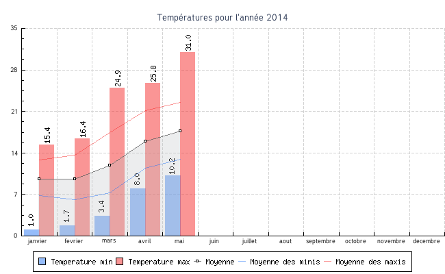 | mai | 10.2 °C | 12.9 °C | 31.0 °C | 22.5 °C | 17.7 °C | 0.0 km/h | -340282346638528860000000000000000000000.0 km/h | NNO |
